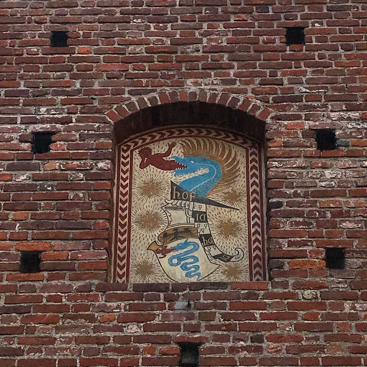 Примечательный факт: Бисцион — вот этот лазурный змей, пожирающий младенца с фамильного герба Висконти-Сфорца — так же используется на гербе белорусского города Пружаны (население меньше 20 тыс.). Дело в том, что герб городу подарила его хозяйка — королева польская и великая княгиня литовская Анна Ягеллонка, дочь Боны Сфорца — правнучки нашего героя.