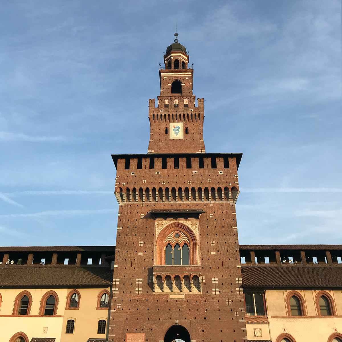 В таких очередных политических вакханалиях наш герой женится на дочери герцога Милана по фамилии Висконти. Там сложно разобраться, корыстный был брак или романтический, но для наёмника в любом случае это очень хорошая партия. Ну и так вышло, что у этого Висконти не оказалось прямого наследника мужского пола. Когда старый герцог приставился в 1447, Милан несколько лет поерепенился, но в итоге в 1450 торжественно вручил власть над городом нашему Сфорца, объявив его своим новым герцогом. Франческо ответил великодушно, приняв герб тестя как свой родовой.