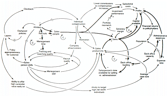 В то время как петли, влияющие на личный кошелёк, мы обычно интуитивно понимаем и в состоянии держать в уме, бизнес-процессы и модели сложных систем полезно держать описанными. Тогда каждый элемент получает возможность быть измеренным, а вся система — получить настройку оповещений для отслеживания изменений.
