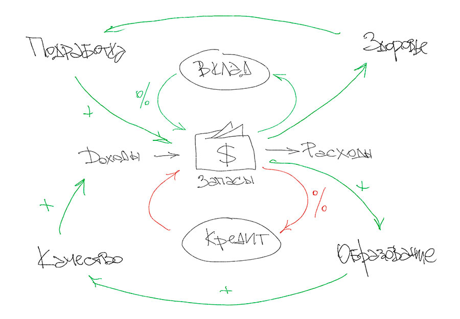 Ты сама можешь с лёгкостью вспомнить и другие петли, которые оказывают прямое или косвенное влияние на твой кошелёк: качество работы, отношения с начальником, репутация, наличие подработки, изменение расходов, повышение квалификации, даже состояние твоего здоровья. Именно описанием всех этих процессов и занимается системная динамика. Через описание взаимодействий петель и потоков появляется возможность предсказывать, как система будет вести себя во времени.